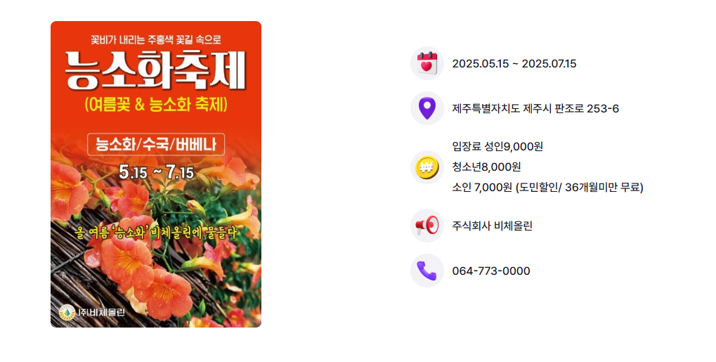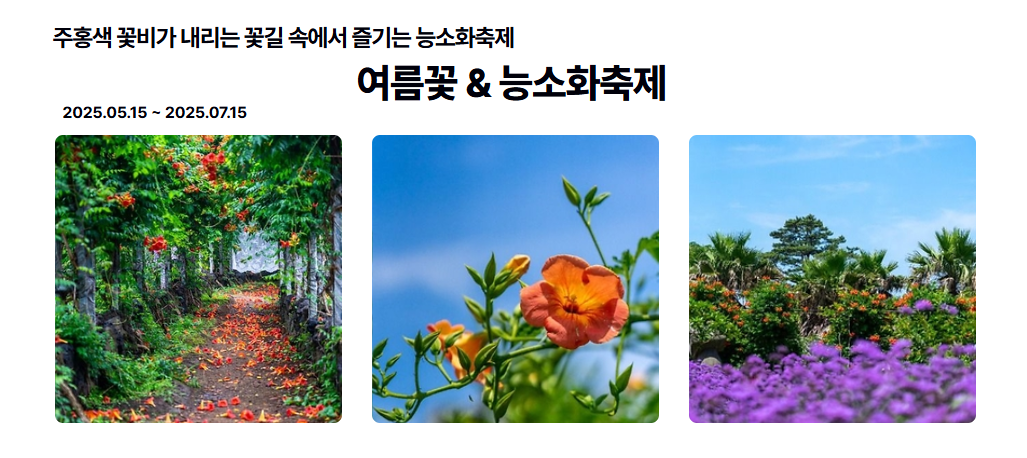 하늘을 능가하는 아름다운 능소화꽃이 일천여미터의 규모로 펼쳐지는 제주 여름꽃축제, 주홍색 꽃비가 내리는 매혹적인 아름다움을 보고 느끼고 즐기는 능소화축제 입니다.