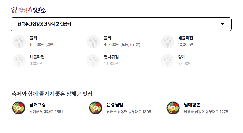 - 남해맛남 판매존: 멸치쌈밥, 해물라면, 회 무침 등 다양한 먹거리 제공