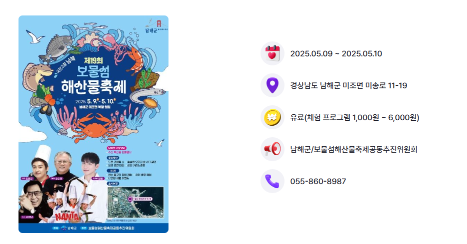 멸치, 굴, 새우 등 싱싱한 남해 수산물, 건강한 사람, 한 폭의 수채화 같은 자연이 한데 어우러진 보물섬 남해 미조에서 열리는 보물섬 해산물축제. 다양한 바다체험과 볼거리, 먹거리로 행복한 여행을 시작해 보세요. 😊 🍵