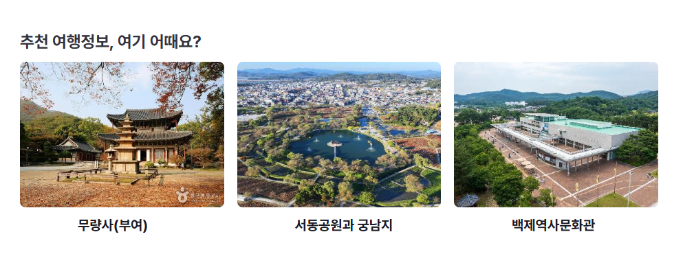 - 백마강 유람선: 강을 따라 백제의 흔적을 감상할 수 있는 코스