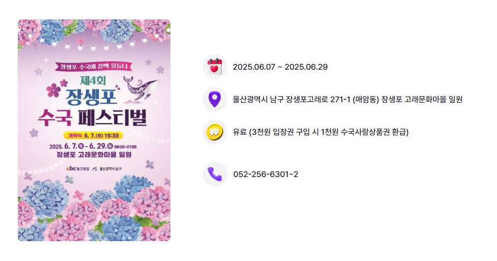 장승포 수국페스티벌은 울산 남구 장생포에서 열리는 여름철 대표 꽃 축제입니다. 장생포는 과거 고래잡이로 유명했던 지역으로, 고래문화마을을 중심으로 다양한 관광 명소가 자리하고 있습니다. 이곳에서 주민들이 직접 조성한 오색수국정원을 중심으로 축제가 시작되었으며, 현재는 울산을 대표하는 여름 꽃 축제로 자리 잡았습니다.