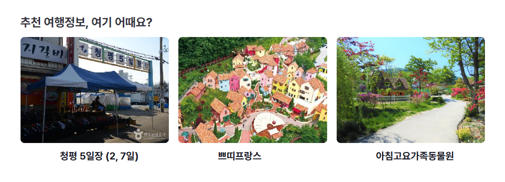 - 경의중앙선 청평역 하차 후 시내버스 또는 택시 이용 (약 15분 소요)