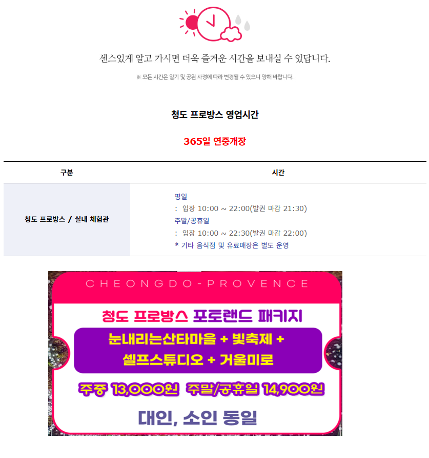 - 청도 프로방스 방문객을 위한 무료 주차장이 마련되어 있으며, 요금소 통과 후 경산·대구 방면으로 직진하면 주차장에 도착할 수 있습니다.