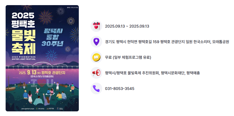 가을의 문턱에서 펼쳐지는 단 하루의 낭만, 평택호 물빛축제는 자연·문화·체험이 어우러진 완벽한 하루 여행 코스입니다. 어떤 프로그램이 가장 기대되시나요? 😊