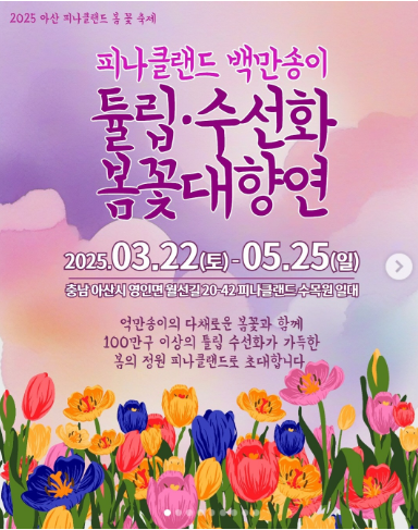 충남 아산 피나클랜드에서 열리는 튤립, 수선화 축제에 대하여 축제일정과 입장료 그리고 관람시간 등 모주 자세히 안내 해 드리겠습니다.