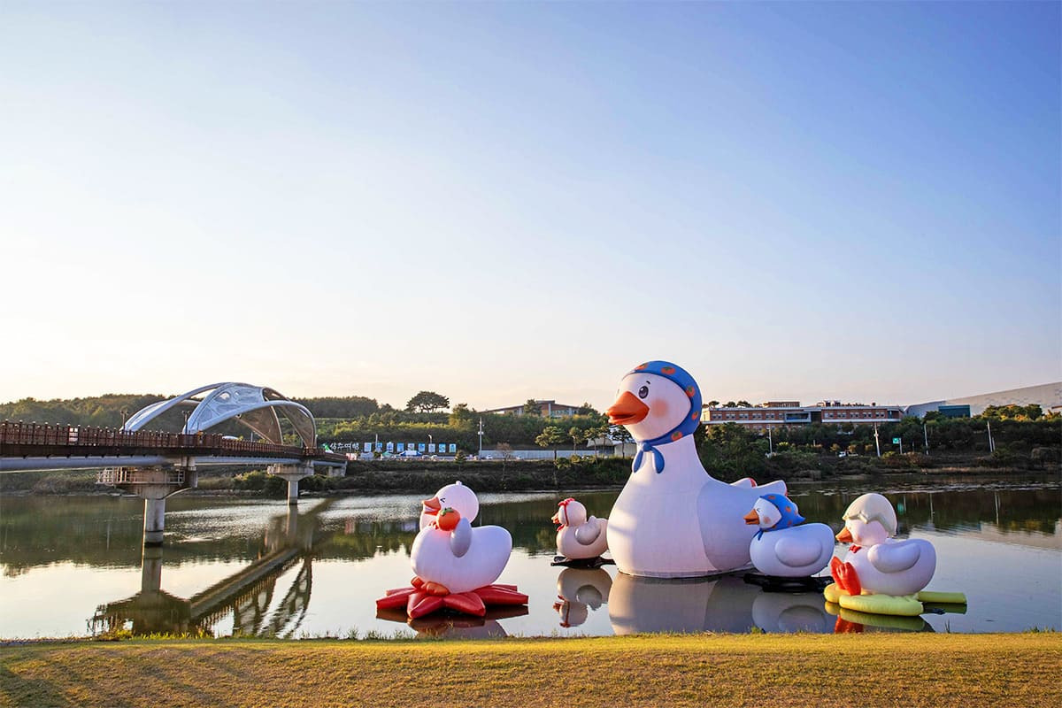 특히 봄철에는 벚꽃나무와 유채꽃밭이 어우러져 포토존으로 큰 인기를 끌며, 자전거를 타고 꽃길을 달릴 수 있는 라이딩 코스도 함께 마련돼 있습니다. 경천섬 내에는 상주시를 상징하는 다양한 조형물과 포토존, 그리고 지역 작가들이 만든 미술 설치 작품도 있어 단순한 자연 탐방을 넘어 문화적 감성도 함께 느낄 수 있습니다.