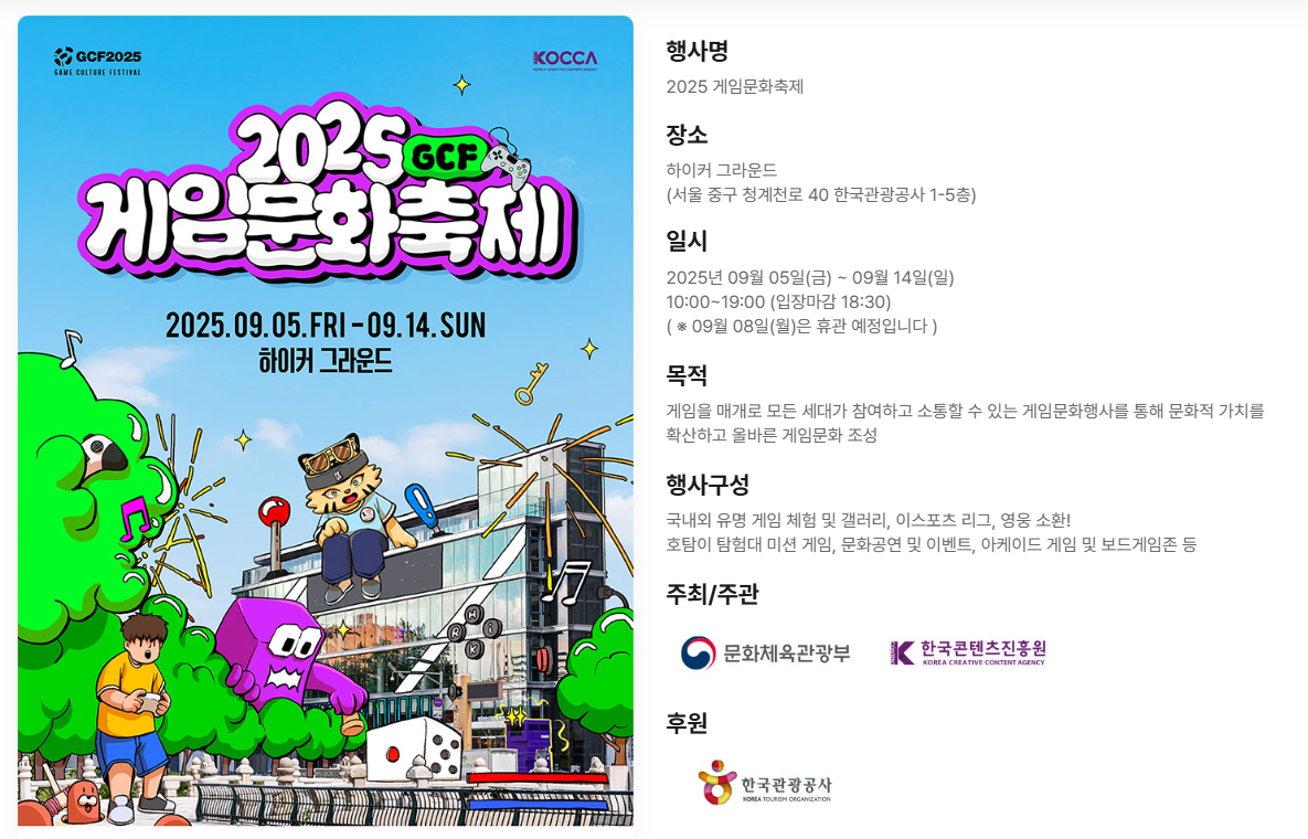 4. 이벤트 프로그램 : 미션 게임을 통한 기념품 배포(프로그램 완료한 분들 대상으로 제공 등), 캐리커쳐이벤트(주말), 코스어 타임어택(주말), 게임 OST 공연(9/6), 이스포츠대회(9/13-14)