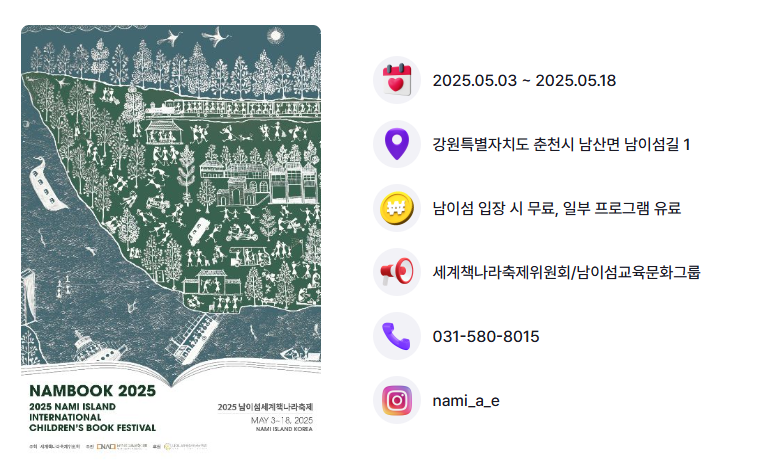 남이섬은 연간 300만 명이 방문하는 한국의 대표적인 관광지로, 아름다운 자연과 문화예술이 조화를 이루는 장소이며, 아름다운 남이섬에서 책을 중심으로 전시, 공연, 조성, 워크숍이 어우러지는 남이섬세계책나라축제가 개최됩니다. 이 축제는 가족, 친구들과 함께 즐길 수 있는 문화 교류의 장이며, 방문객들에게 동화 같은 특별한 경험을 제공할 것이다. 2005년 시작해 올해로 12회째를 맞이하는 남이섬세계책나라축제는 지난 9회째부터 주빈국 테마를 적용하여, 2019년 덴마크, 2021년 포르투갈, 2023년 핀란드를 각각 주빈국으로 삼았으며, 2025년 축제의 주빈국은 인도입니다.