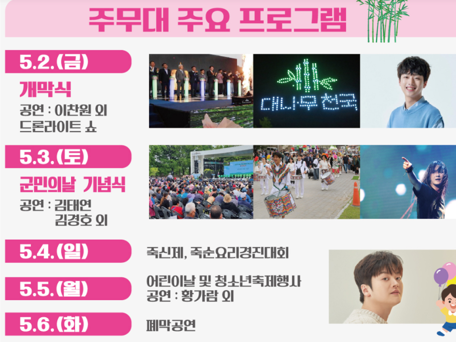 - 푸드 페스티벌 – 죽순 요리 경연대회, 지역 특산물 판매