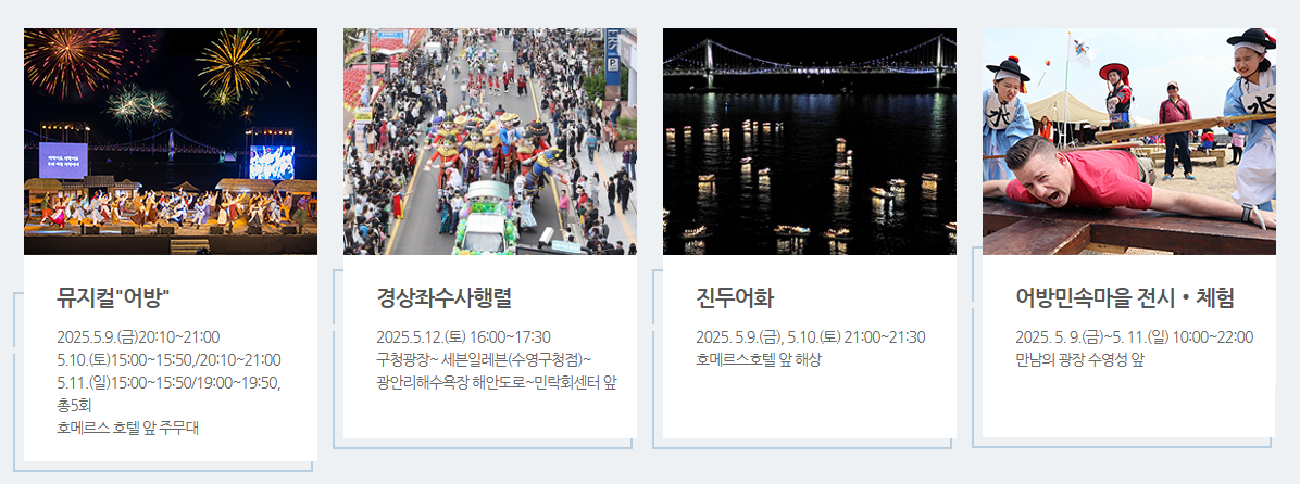 - 뮤지컬 어방: 축제의 주제를 반영한 공연으로, 수영의 역사적 사실을 현대적으로 스토리텔링.