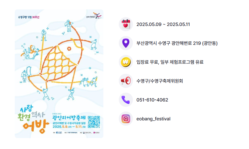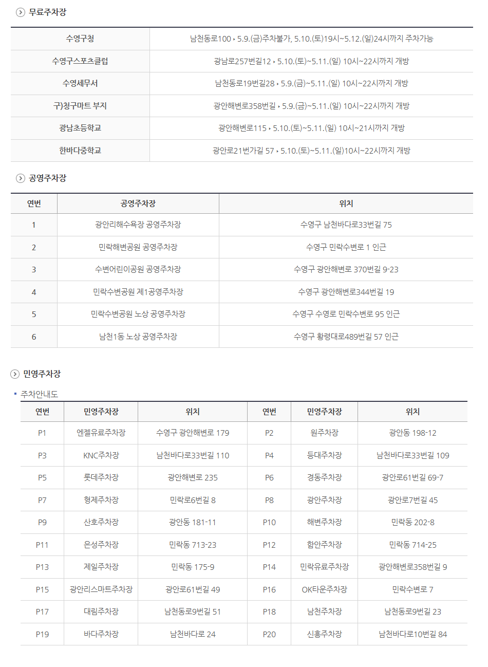 - 무료 주차장: 광안리 해변 인근 지정 주차장 (수영구청 주차장은 5월 9일 금요일 이용 불가).