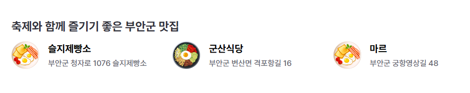 부안은 백합 요리와 뽕잎 요리로 유명합니다. 축제 방문 시 꼭 들러야 할 맛집을 소개합니다: