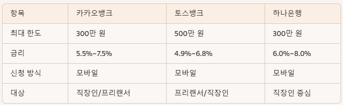 - 특징: 직장인뿐 아니라 프리랜서도 신청 가능, 신용점수 기준