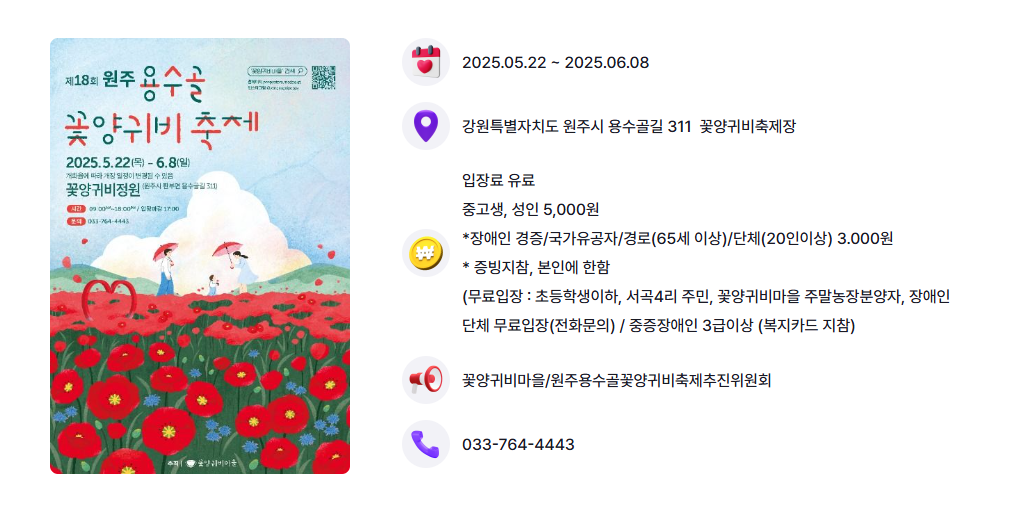 단체 무료입장(전화문의) / 중증장애인 3급이상 (복지카드 지참) - 주관사 정보 : 원주용수골꽃양귀비축제추진위원회