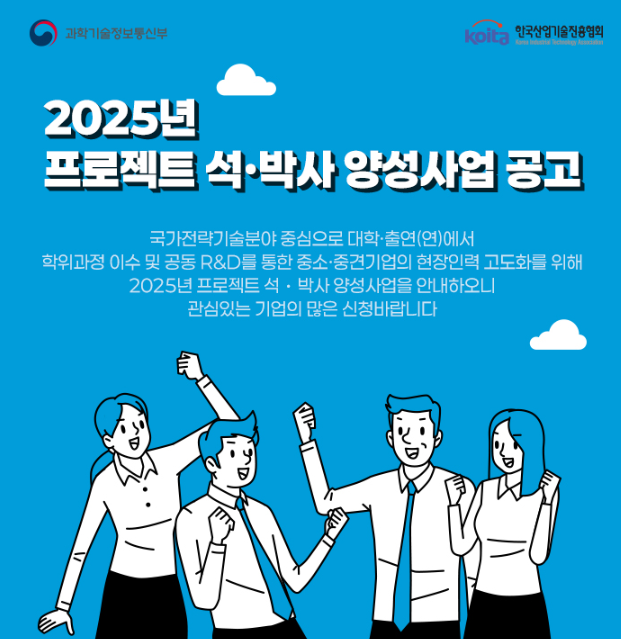 국가 전략기술분야 중심으로 대학, 출연에서 학위과정 이수 및 공동 R&D를 통한 중소, 중견기업의 현장인력 고도화를 위해 2025년 프로젝트 석, 박사 양성사업을 안내하오니 관심있는 기업의 많은 시청바랍니다.