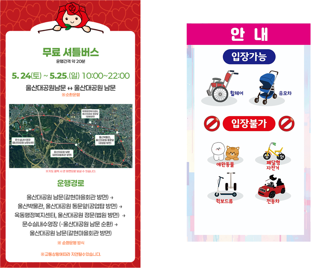 - 무료 셔틀버스 운행: 5월 24~25일 남문 ↔ 동문 ↔ 문수실내수영장 순환